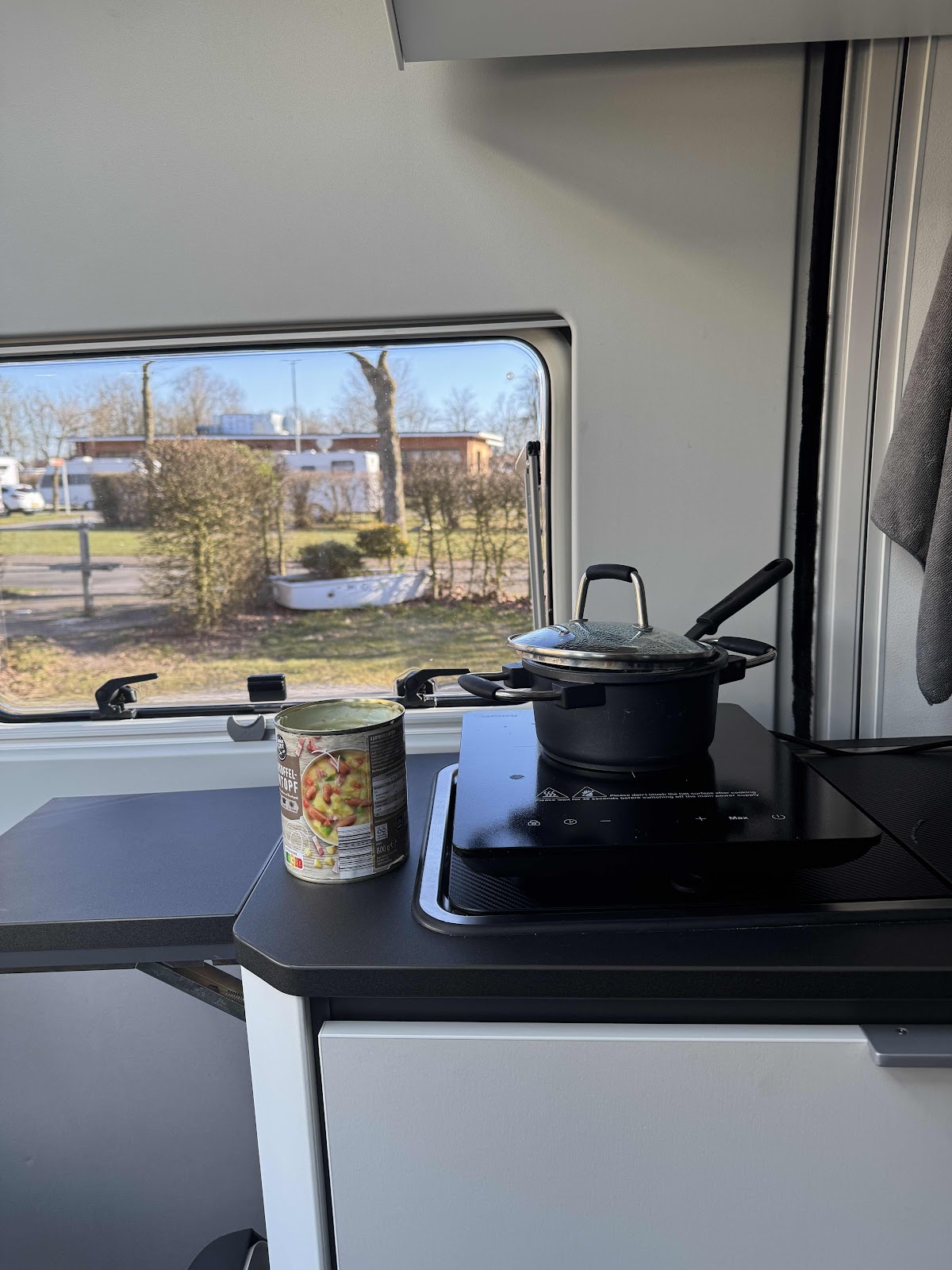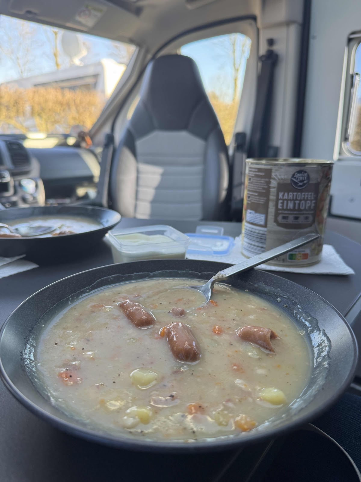 Die Induktionsplatte macht die Dosensuppe in unter 5 Minuten heiß... ist zwar kein wirklicher Genuss. Aber wir wollen ja sparen. Deshalb geht es jetzt den Vorräten an den Kragen.
